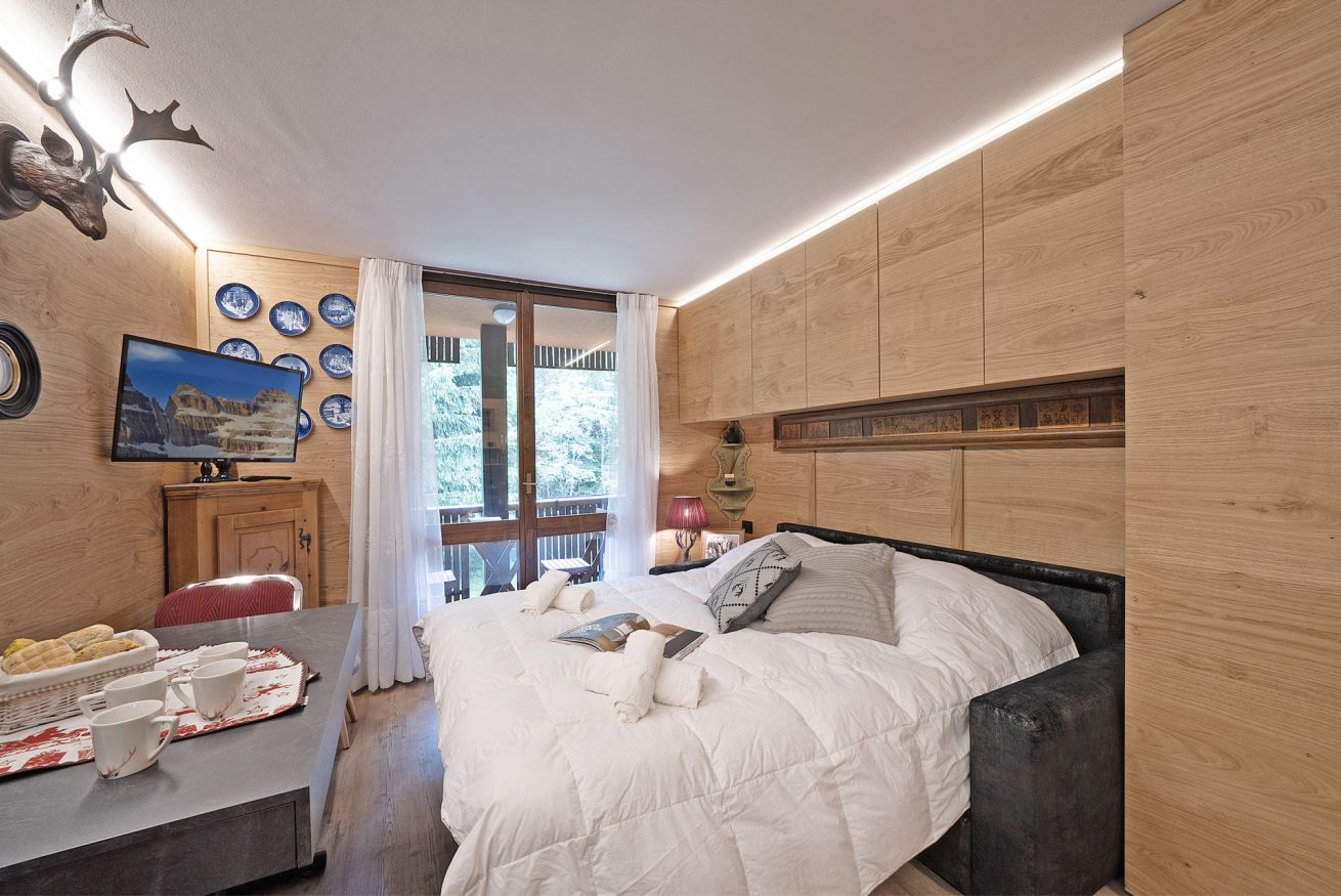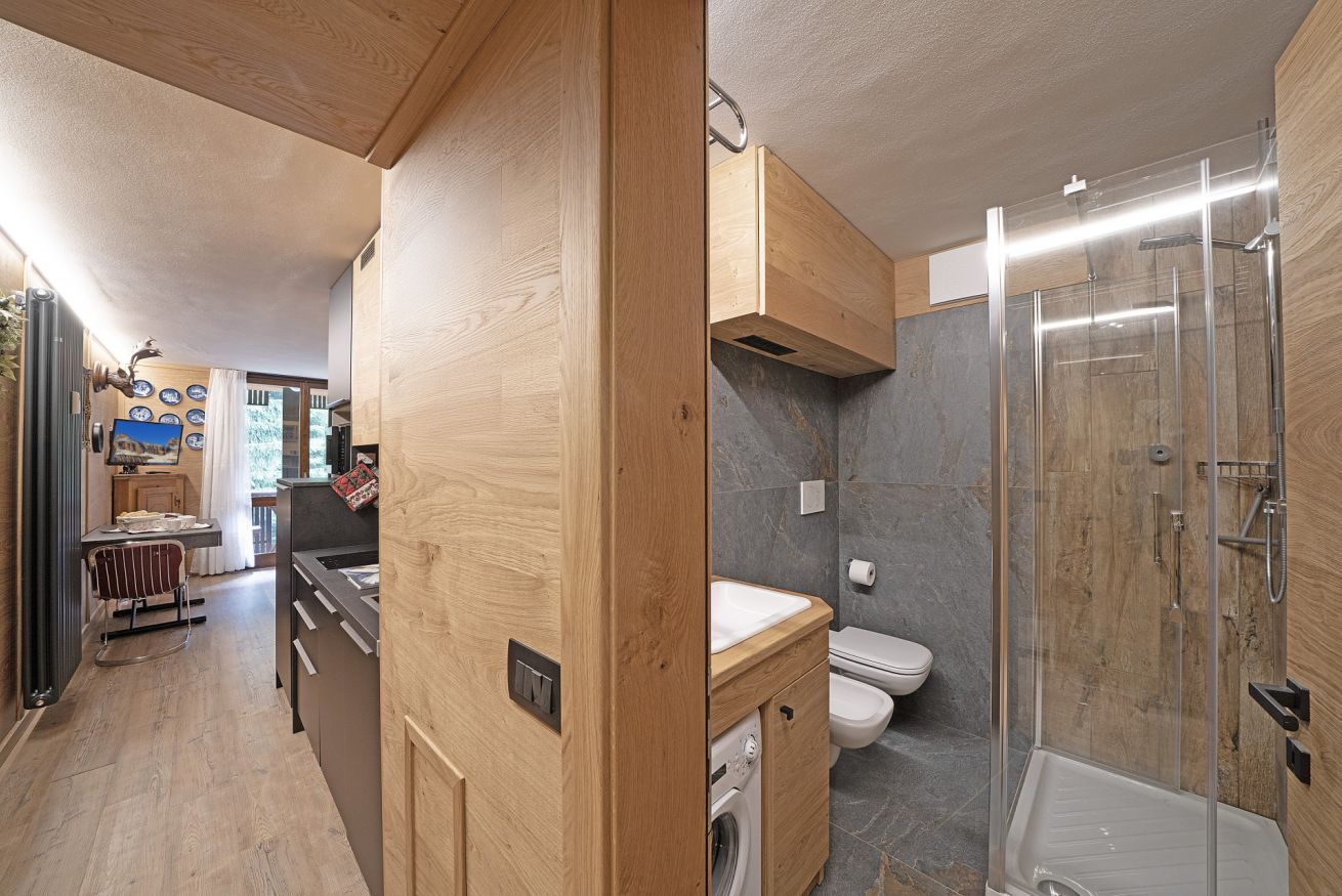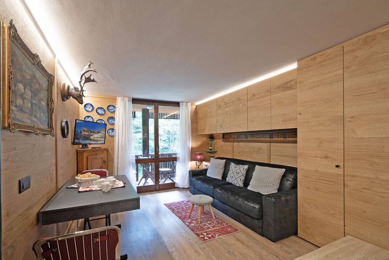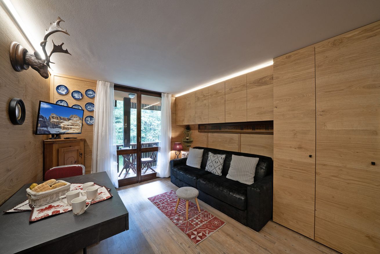 Madonna di Campiglio, elegante Monolocale in tipico stile Alpino, dotato di ogni confort adatto a 3 persone, 1 Bagno, uno splendido terrazzo dove poter godersi colazioni, pranzi e cene. Connessione WI-FI, lavatrice, posto auto